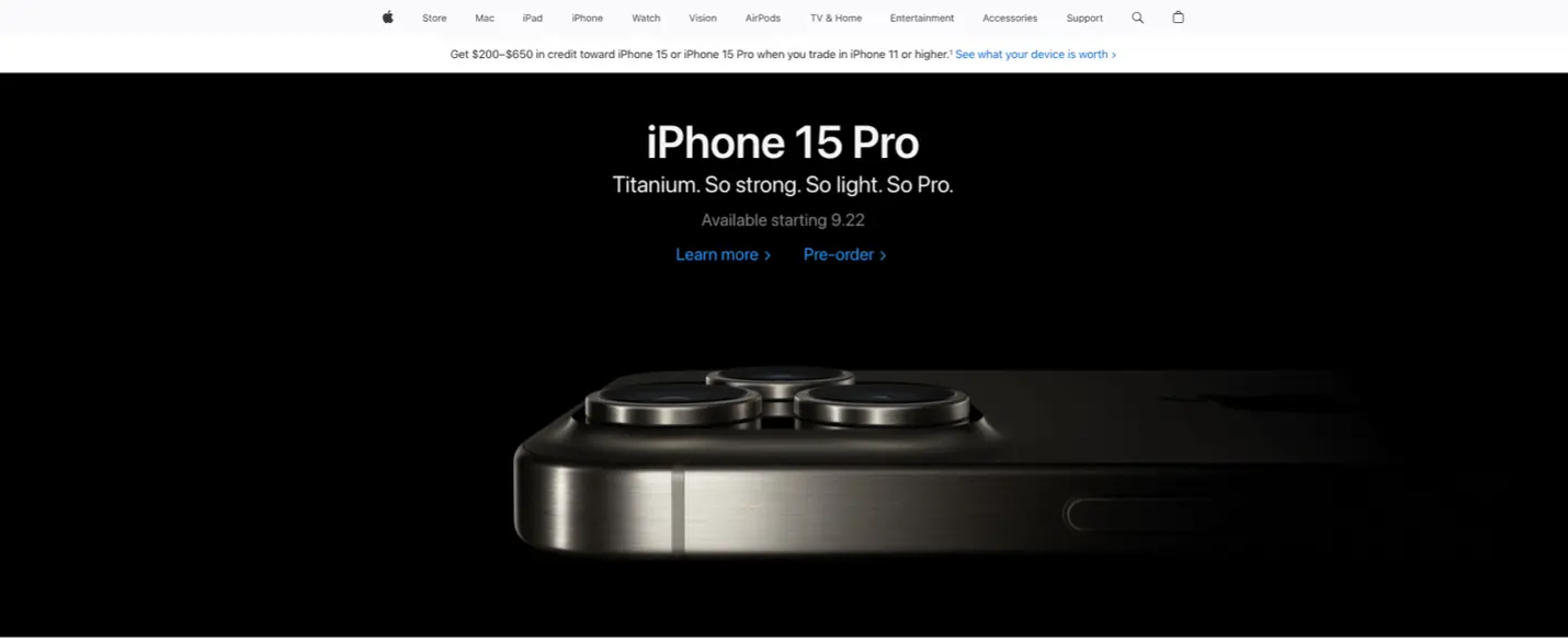 In the example below, your eyes are immediately drawn to the words "iPhone 15 Pro". Notice how their menu bar is very small compared to the banner image text. This is intentional as they want to push pre-order sales of their newest iPhone. They don't want you to navigate through their website, so they minimize that text and draw your attention directly to the clear goal of the site. Apple knows that they only have a few moments to catch a user's attention, and they want you to pre-order and learn more about their latest and greatest products. This is exceptional design and a strategy they've been using for many years now. Simple, yet effective.