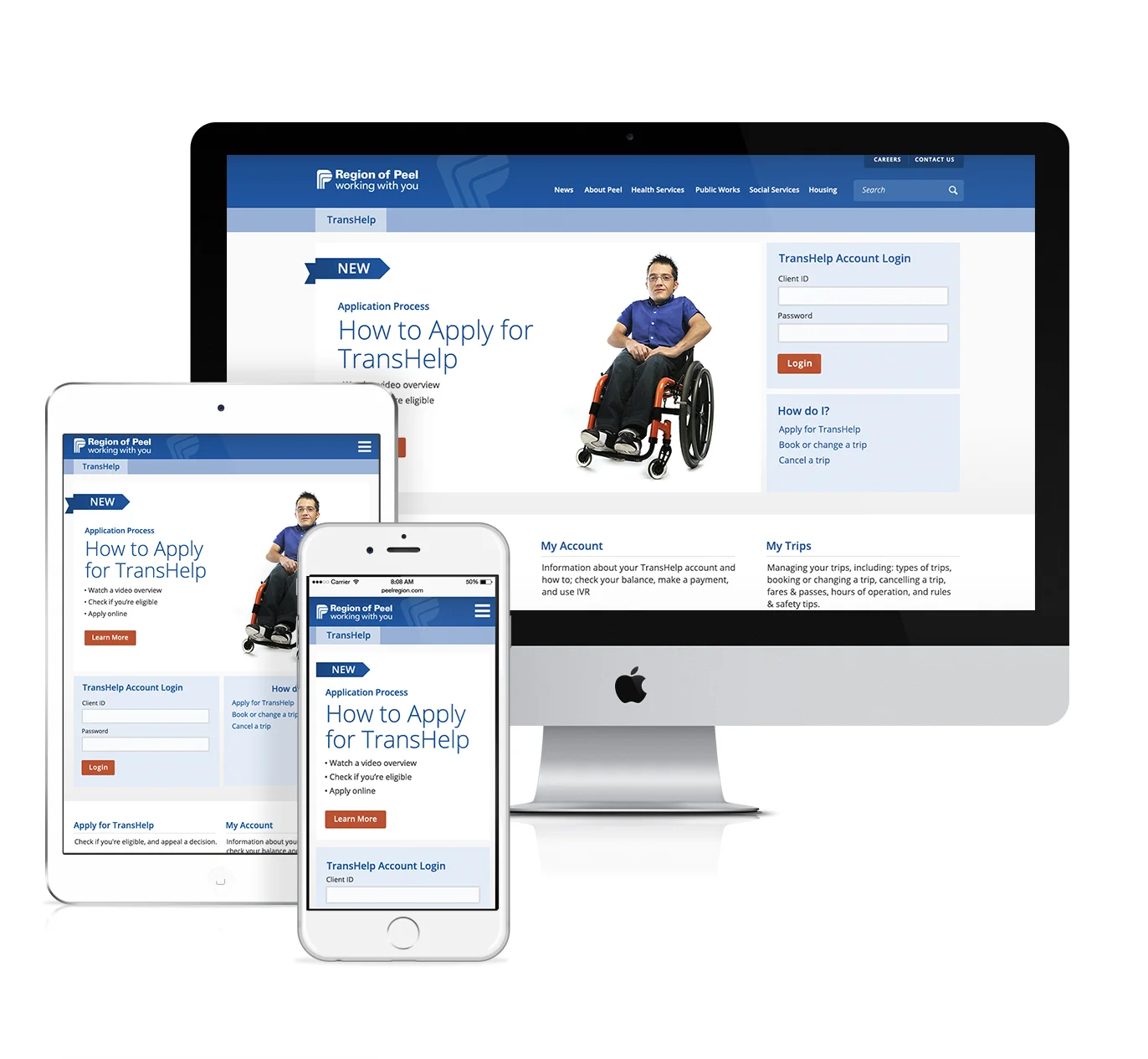 Interpix then executed and analysis of current site, including a competitor analysis focusing on workflows. In order to determine core design innovation points and clearly communicate design and product assumptions. Which includes developing an understanding about business objectives, the intrinsic value of the current experience and the current state of the project requirements, known issues regarding constraints (including technical limitations) and opportunities for the user-centered design process. A set of usability tests were conducted with both low and high-fidelity prototypes. The goal was to evaluate how users perform using the TransHelp edibility application form. This gave the Region of Peel the opportunity to iterate and adapt on the prototype before committing to expensive development.
