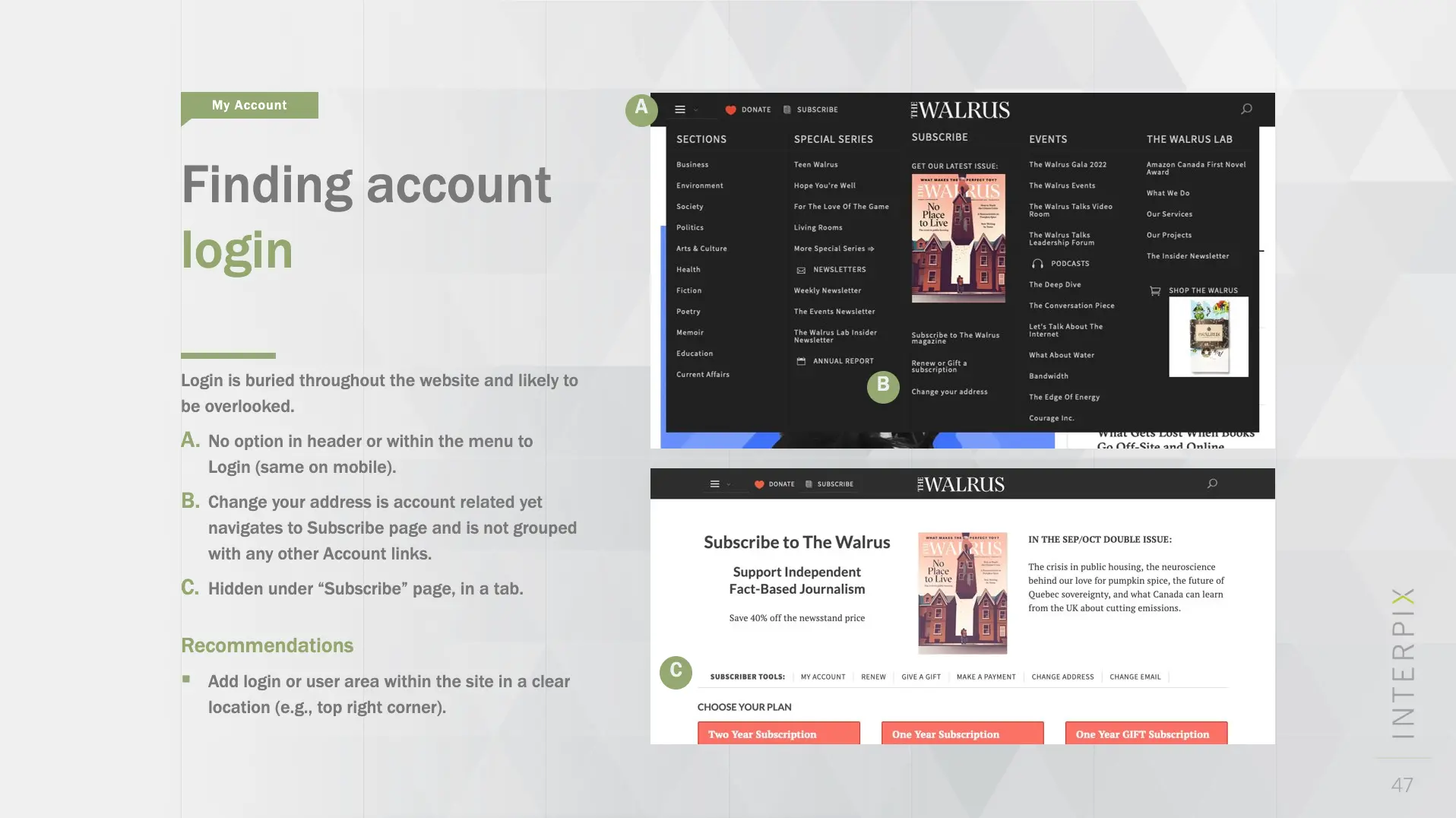 Interpix Design partnered with The Walrus, a registered charity and prominent publishing house in Canada, to conduct a comprehensive audit of their website. With a mandate to enhance the user experience (UX), our objective was to help The Walrus boost its user engagement and increase each visitor’s content consumption per visit.